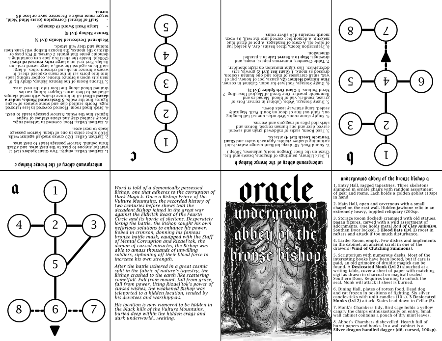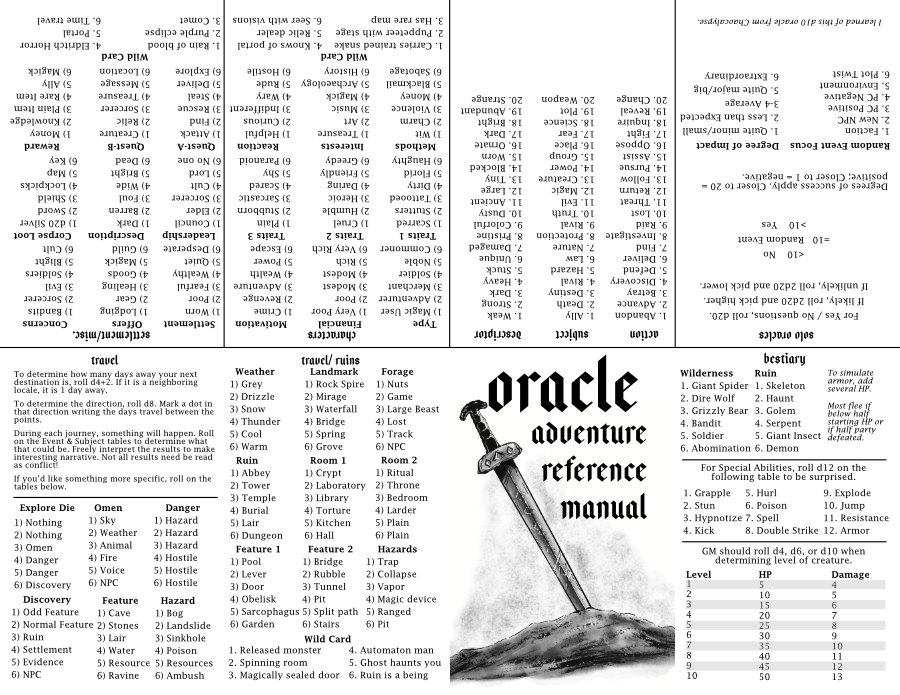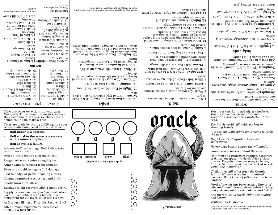 Oracle is a rules-lite ttrpg that runs on 4 stats, d20 roll under, and minimally implied classes. Use of polyhedral dice required.