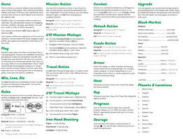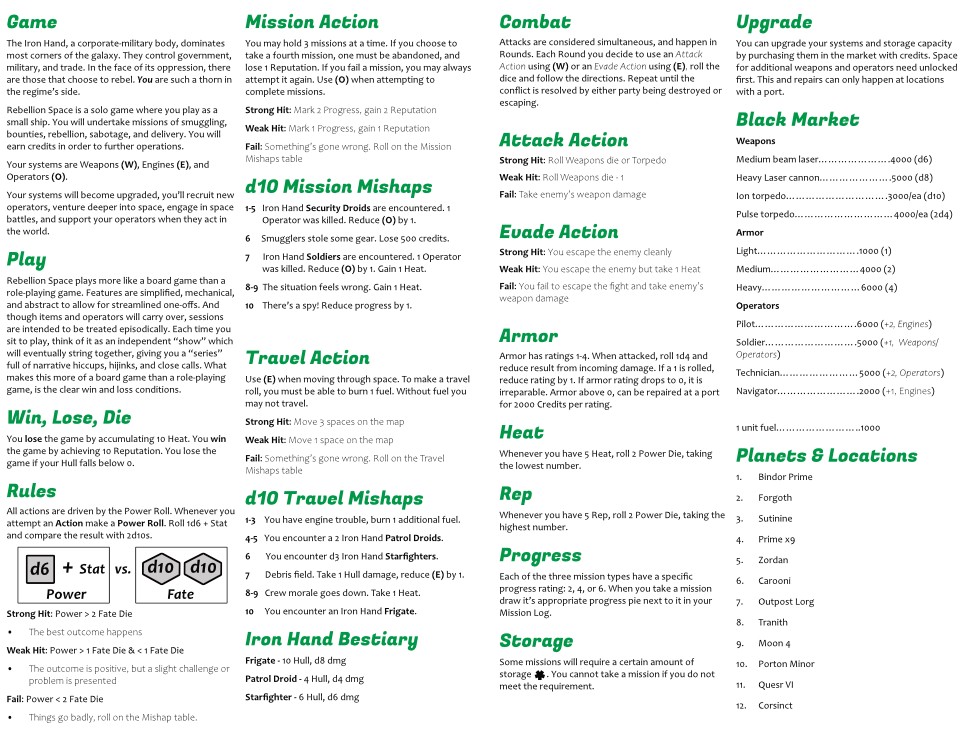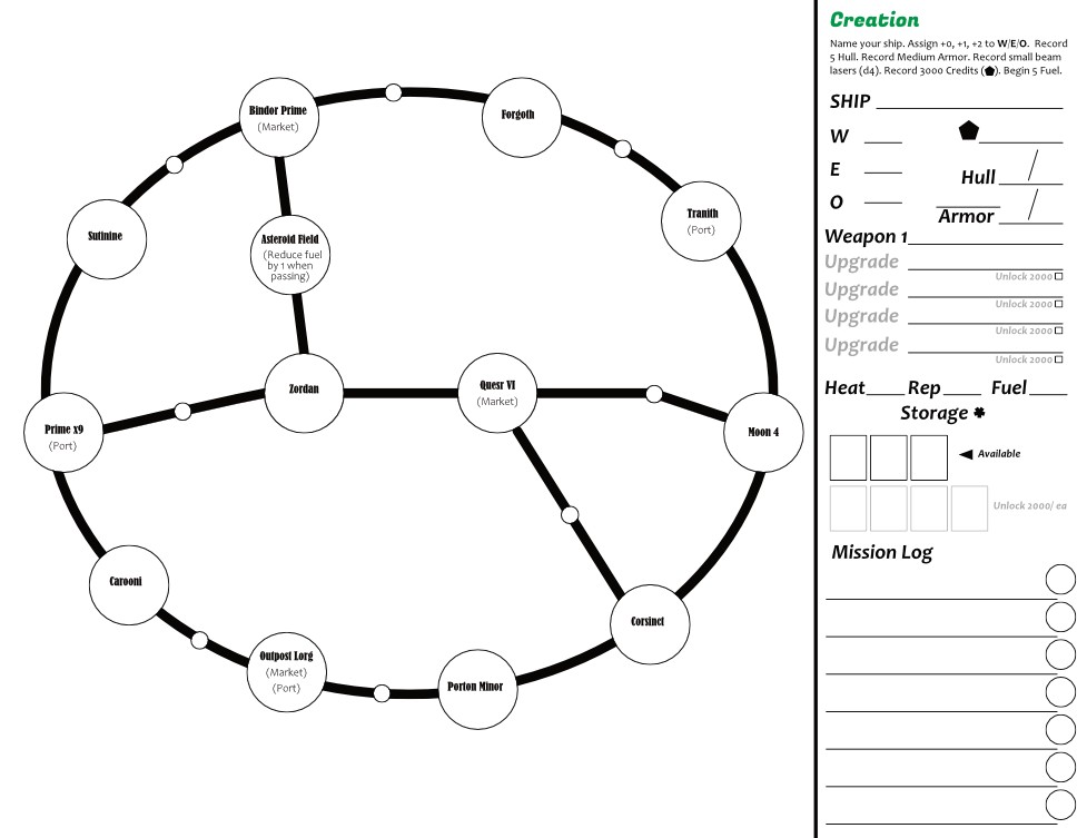 Per some of the feedback I received, I have made some changes to this game. it is still a simple game, meant to be largely a filler experience for hotels, traveling, or something light to play while watching a show. However, I've clarified a few things (beginning fuel, armor). Enhanced combat with a new Evade tactic. Made a few tiny tweaks here and there.