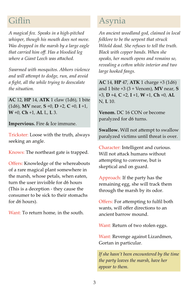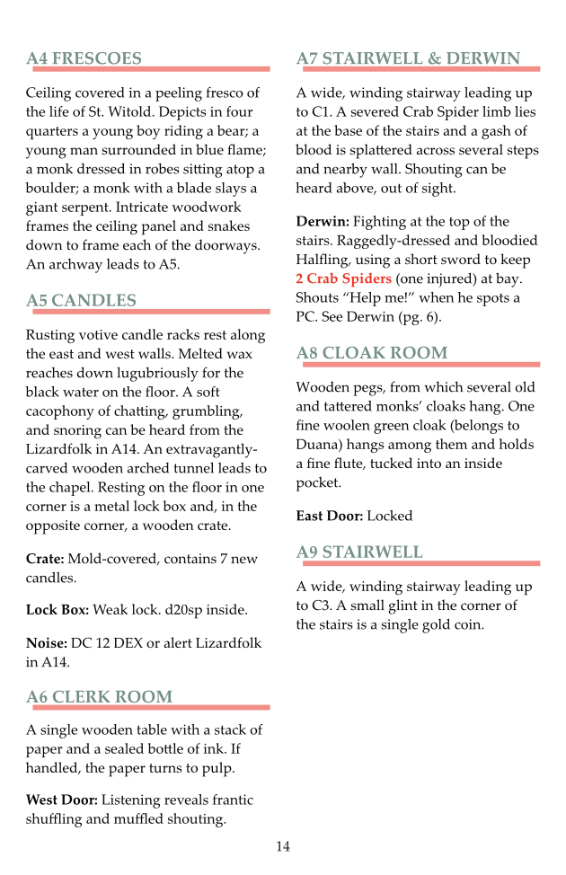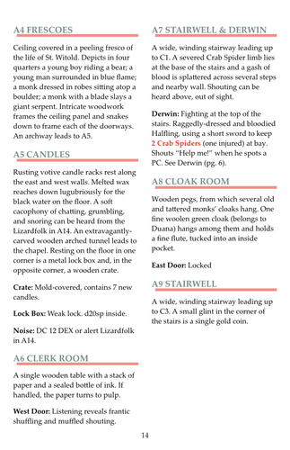 The party will journey to the nearby monastery with instructions to retrieve the steeple bell and the physical remains of their saint. They can traverse a marsh, meet a godly fox and serpent, explore a 25 area monastery, work through a 9 area crypt, battle Lizardfolk, Spiders, and Leeches. They may possibly rescue and recruit 2 halflings on their own epic journey (possible seed for the next adventure), and learn of another 5 area barrow mound nearby.
