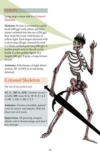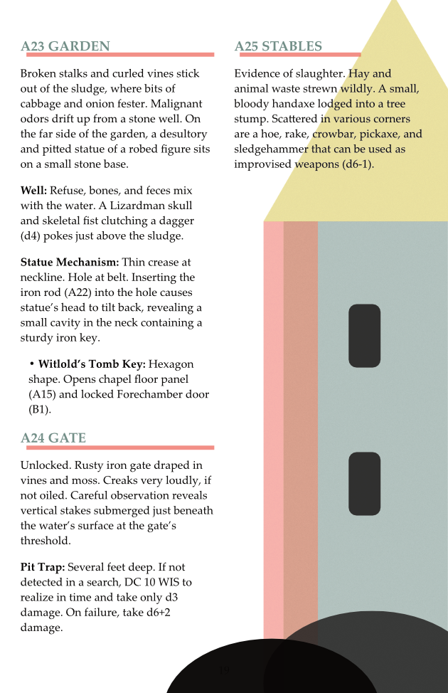 36 pages (includes covers). Clear and easy to navigate layout. A mix of evocative prose and simple details. Quirky design-based art. Full stats for the Shadowdark RPG.